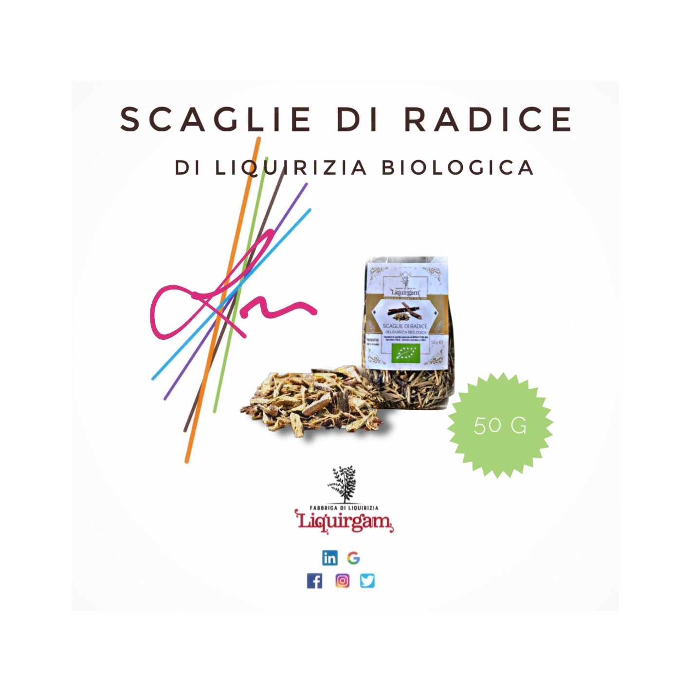 Scaglie di Radice di liquirizia Biologica 50 g - Bustina alimentare contenente 50 g di scaglie di radice da agricoltura biologica. Lavorazione raffinata della nostra radice biologica. Il consumo è consigliato per infusi. Ingredienti: liquirizia biologica Ingredients: organic licorice