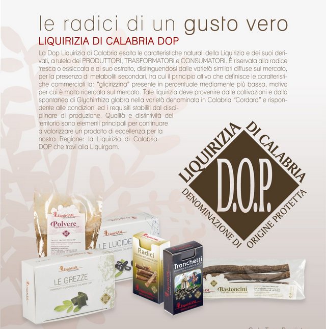 La Dop Liquirizia di Calabria esalta le caratteristiche naturali della Liquirizia e dei suoi derivati, a tutela dei PR0DUTTORI, TRASF0RMATORI e CONSUMATORI. E' riservata alla radice fresca o esiccata e al suo estratto, distinguendosi dalle varietà similari diffuse sul mercato , per la presenza di metaboliti secondari, tra cui il principio attivo che definisce le caratteristiche commerciali la : "glicirizzina" presente in percentualmente piu bassa, motivo pe rcui è molto ricercata sul mercato.
