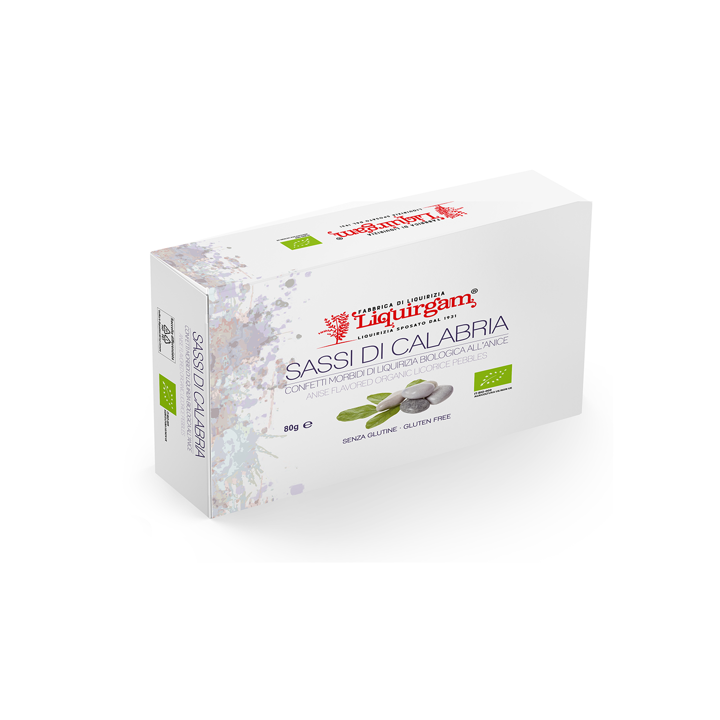 I sassi di Calabria sono composti da liquirizia gommosa biologica all'anice: un compromesso tra il gusto autentico della liquirizia all'interno e lo zucchero croccante all'anice che va a ricoprire l'esterno del confetto.